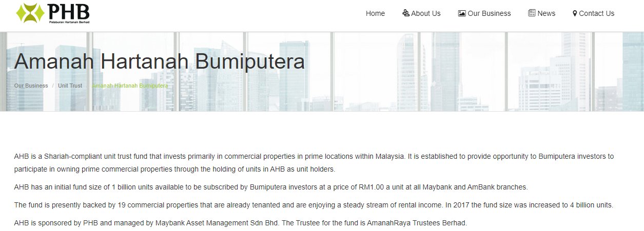 AMANAH HARTANAH BUMIPUTERA AHB 1. Pelaburan Hartanah Bhd PHB dan Maybank Asset Management Sdn Bhd MAM mengumumkan pengagihan pendapatan akhir dana Amanah Hartanah Bumiputera AHB. Amanah Hartanah Bumiputera AHB adalah alternatif yang baik untuk para pelabur parking duit lebihan daripada RM9980 dalam akaun Tabung Haji.